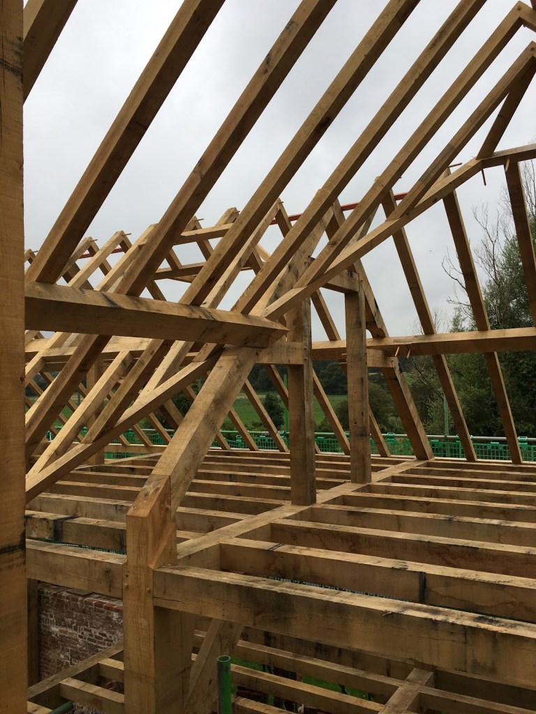 In Part 1 of this three part series about the reconstruction of an historically significant timber frame water mill located on the beautiful River Test in Southern England for which he was responsible, Gavin shared some background about the project, some design details, the challenges his team faced at the jobsite, and the fabrication, delivery, and assembly of the green oak timber frame on-site. In this post he will share some details about framing the roof structure. If, Gentle Reader, you have not read Part 1, you may want to do so before reading further.