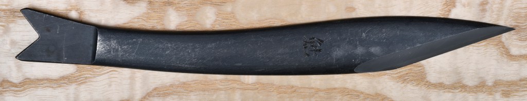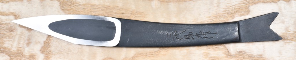 This tool’s name is pronounced kee/ree/dah/shee koh/gah/tah/nah, often shortened to “kiridashi,” and written 切り出し小刀 in Kanji. It translates directly as “small cutout sword.”