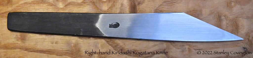Kiridashi kogatana come in right-hand and left-hand configurations, with the right-hand variety being most common. To differentiate a right-handed knife from a left-handed one simply hold the knife with the cutting edge facing downward. The bevel of a right-handed knife will be on the right side as seen from above.