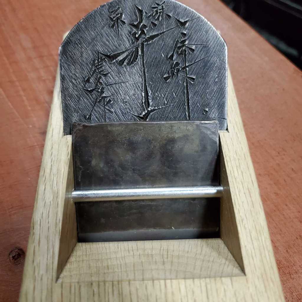 While it used to be that Western wooden-bodied planes had interesting maker’s marks stamped in their blades, such is no longer the case. Japanese planes, on the other hand, make a point of having decorative engraving, stampings and surface treatments applied to their blades for a significantly more interesting presentation of the blacksmith’s art than the plain, boring sanded steel of modern Western planes.