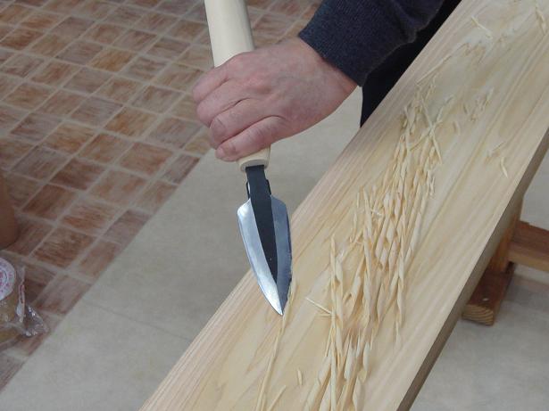 The Japanese Yariganna in-use. Prior to the advent of the handplane to the islands of Japan, an approximation of this tool was used for finish-planing the surfaces of wood following the adze. It creates a unique and practical surface texture.