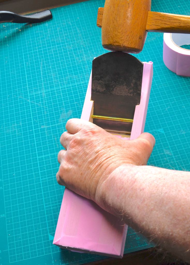 - Insert the blade into the grooves and tap it with your wood, plastic or rawhide metal mallet (egads, not a metal hammer!) until the cutting edge is nearly projecting from the mouth. You may need to really wack the blade hard 5~10 times to accomplish this the first time.