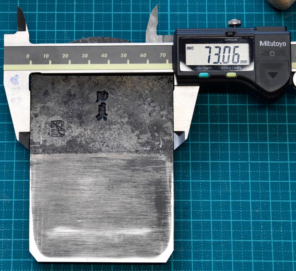 Use your vernier, dial or digital caliper or mechanical divider to check that the blade does indeed become narrower in width from the point where it exits the grooves at the top surface of the body and the point where the cutting bevel begins. If it doesn’t, you will need to grind in some taper. How much? Mr. Nakano’s blades typically taper the amounts shown in the photos above, but they are handmade and each one is little different.