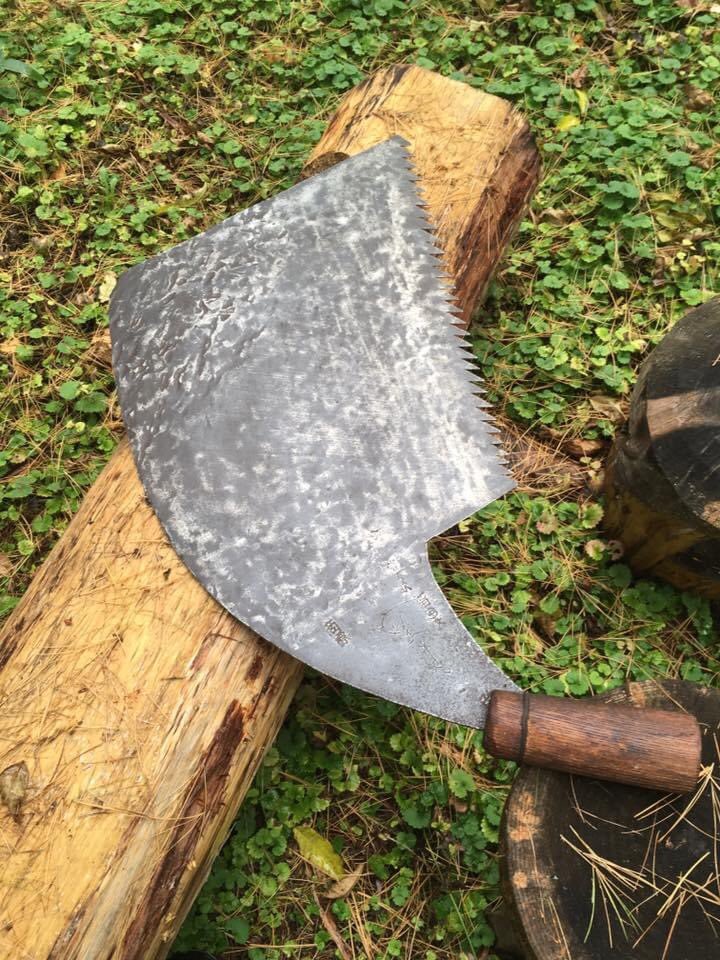 Various timber and arborist’s crosscut saws have a gradually bent tang, while others have a cranked tang like the saw which is the subject of this article and shown in the photo above. Not seen in the photo is the tapered portion of the tang inside the stubby handle.