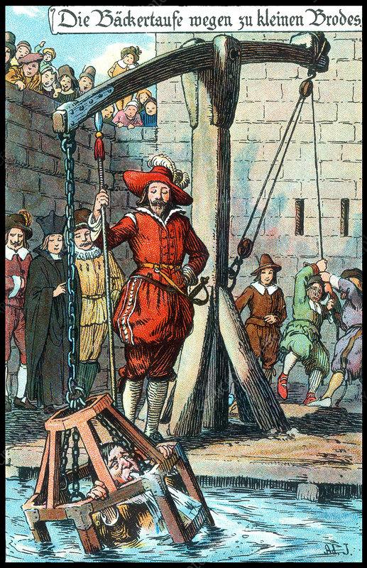 German postcard depicting a ducking-stool being used to punish a baker accused of making his loaves too small. Would that such public persuasion could be dealt to every politician caught lying or public employee that takes bribes. I think the world’s lakes and rivers would be overcrowded with ducking chairs greatly improving society.