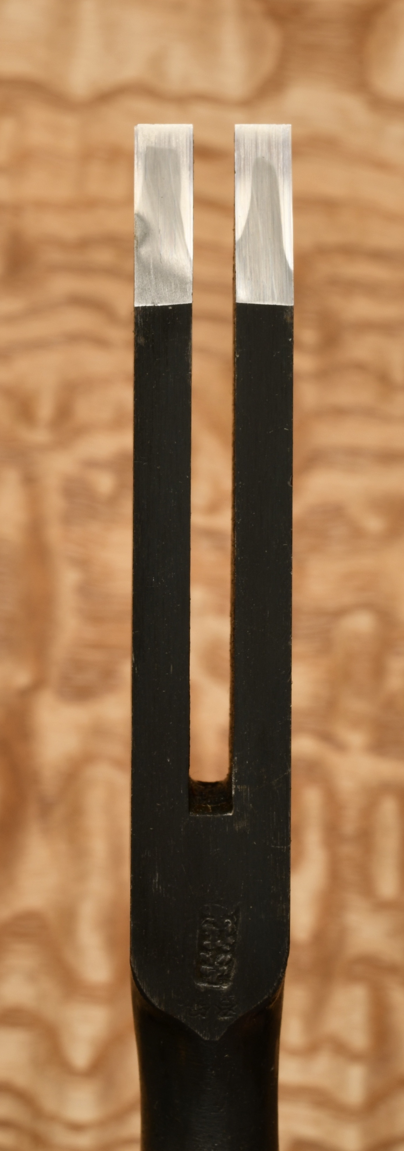 The name is a variation of the name of the standard mortise chisel ” mukomachi nomi” in my previous post, and no, I still don’t know what it has to do with ” waiting over there.” In front of this is added ”nihon” (二本) with ” ni” meaning ”2” and ” hon” being a counter for longish things, like pencils or trees, or in this case, blades. The word is pronounced ” knee hone.”