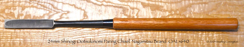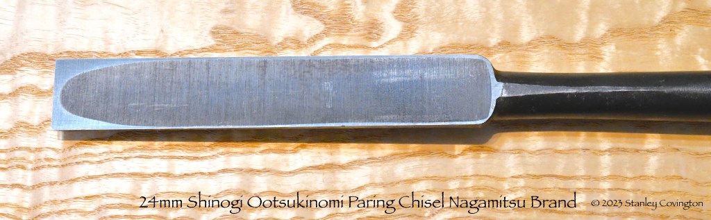 The 24mm chisel is forged in the shinogi style with a more triangular cross-section to provide clearance for the blade in tight places to pare the many dovetail joints used to attach beams, purlins and bottom-plate (土台) timbers, as well as the end walls of the many 24mm mortises commonly found in traditional timber framing work.