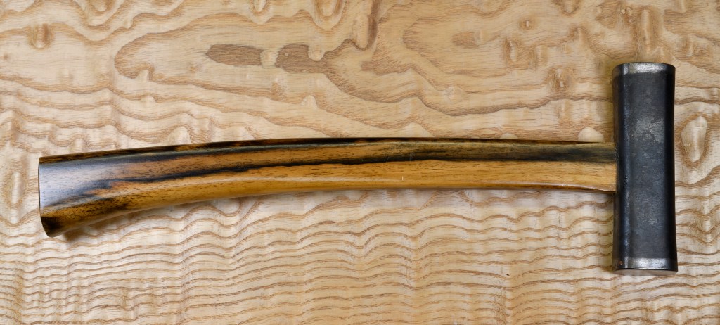 Hickory is recognized world-over as the best generally-available material for handles, but it’s grain and color are boring. It should be easy for Gentle Readers to procure since it is sold as replacement tool and axe handles in most hardware and home centers.