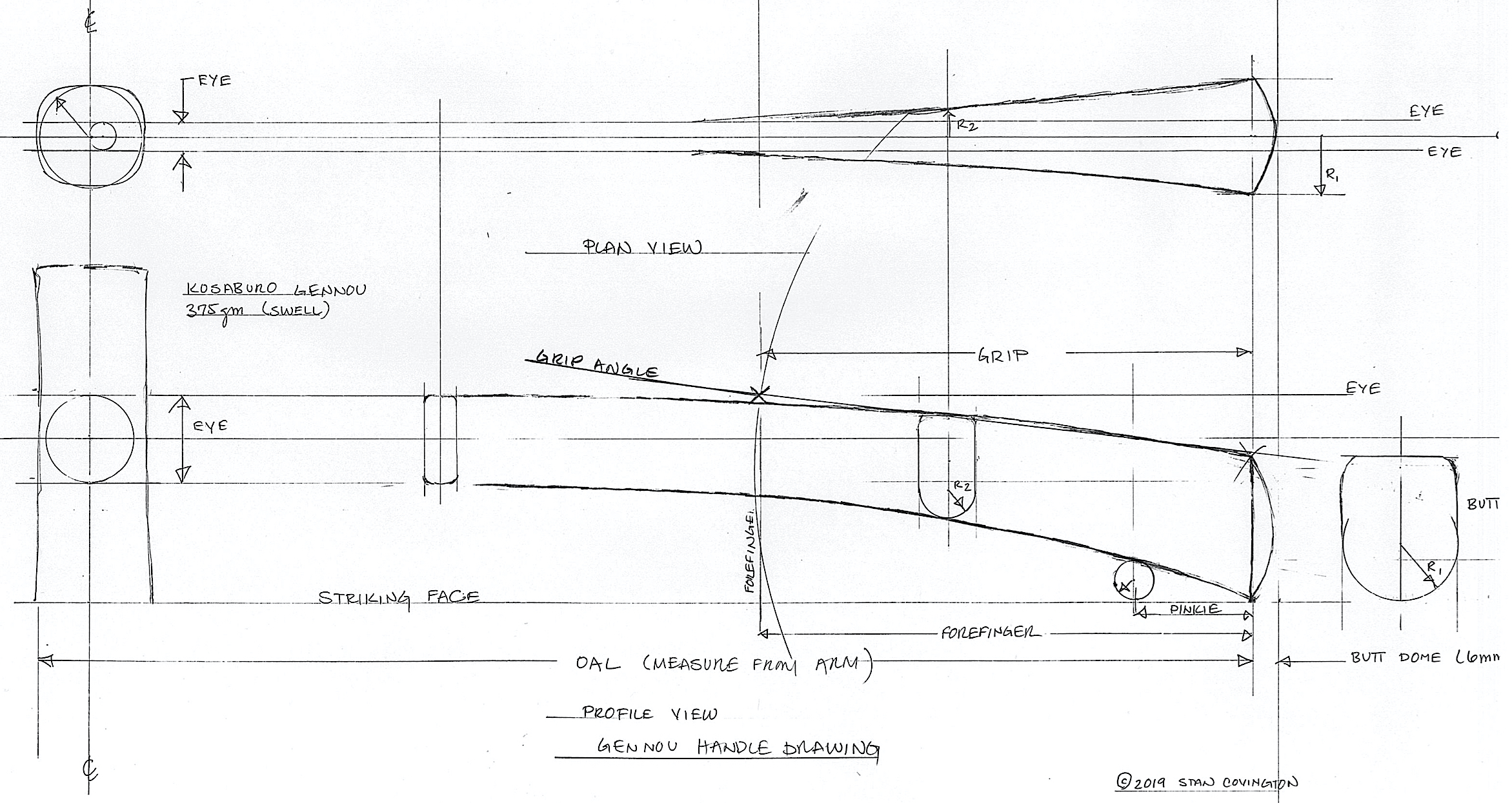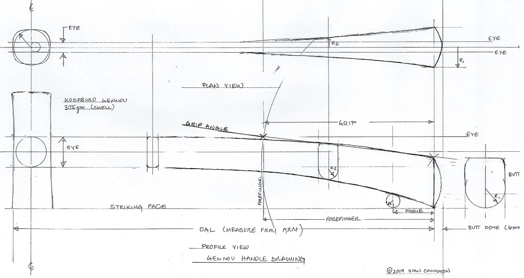 In the previous 6 posts in this series we guided Gentle Reader in creating a drawing of a high-performance, minimalist handle to fit your gennou head and body closely.