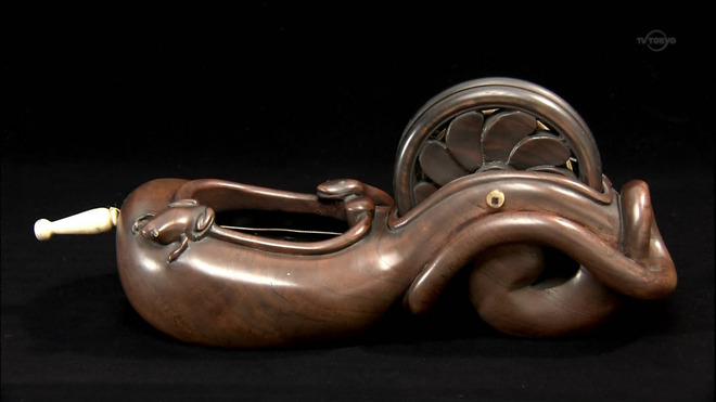 A museum-quality antique sumitsubo ink-pot depicting a snake hunting a frog around the ink pond. Mr. snake’s tail wraps around the wheel.