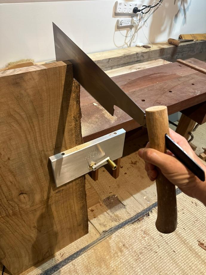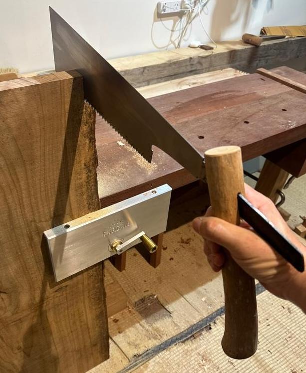 The second marking gauge you should have is called a “mortise gauge.” This tool has two pins or blades to make 2 parallel lines, at a set distance from each other, with a single stroke. It’s especially suited for quickly and precisely marking mortises and tenons and installing hardware. I prefer the Japanese version of the mortise gauge called the “kamakebiki” (sickle mortise gauge shown above) which has two L-shaped steel blades, easily adjusted and easily resharpened. A handy tool indeed.