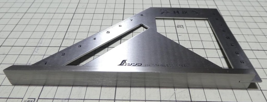 Essential for checking lumber, laying-out and marking of larger joints, casework, checking square of larger joints and assemblies, working with doors, panels, and plywood, and many other tasks. Regarding materials, carbon steel squares are heavy and always turn red and go away, so I don’t recommend them if you have a choice. Stainless steel is more durable, but still heavy and costlier. Aluminum will suffice. You may need to true it, but this is easily done with a hammer, punch and file. Just ask me how when you think it’s necessary. This is a tool with a long history you should be proud to own. In all nations more than a few centuries old, the carpenter’s square has been associated with stability, honesty, righteousness and order, all traits a craftsman should seek to foster in himself, his family and his crew. In Japan, this tool was traditionally extremely expensive and was considered the craftsman’s “spirit” in the same way the sword was revered as the warrior’s spirit by the warrior caste. Indeed, in past centuries, stepping over a carpenter’s square resting on the floor or even ground was seen as a mortal offense resulting in bloodshed at times. Such emotional sentiments did not extend to other carpentry tools. The Japanese version of this tool goes by several names written several ways including “kanejaku,” “magarijaku”(written 曲尺or 矩尺), “sashigane”指矩, and several other names. Don’t ask me why. Unlike the Western square of uniform thickness, the better Japanese kanejaku have a variable cross section for less weight/greater rigidity. Being thinner, smaller, more flexible, and much lighter in weight, the Japanese square is handier to transport and use in the field. Of course, it has a couple of disadvantages such as not handling longer/wider boards as well, and being more difficult to control because it’s more flexible. Horses for courses, of course, so I own and use both types.